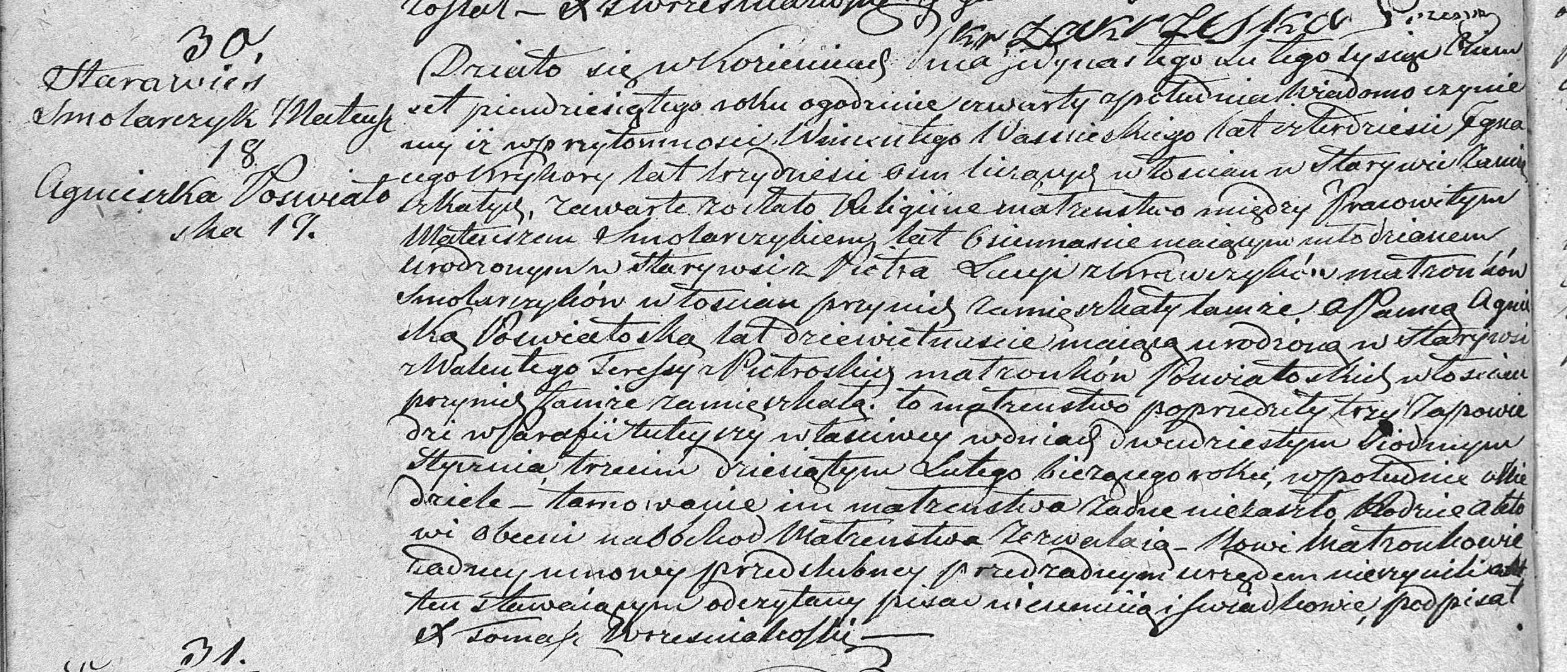 metryka ślubu Mateusz Smolarczyk s. Piotra i Łucji i Agnieszka Poświatowska c. Walentego i Teresy 11.02.1850 Kozienice