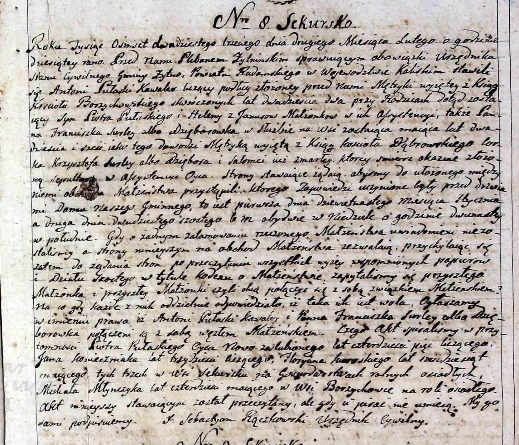 metryka ślubu Antoni Puławski i Franciszka Dzięborowska 2.02.1823 Sekursko |