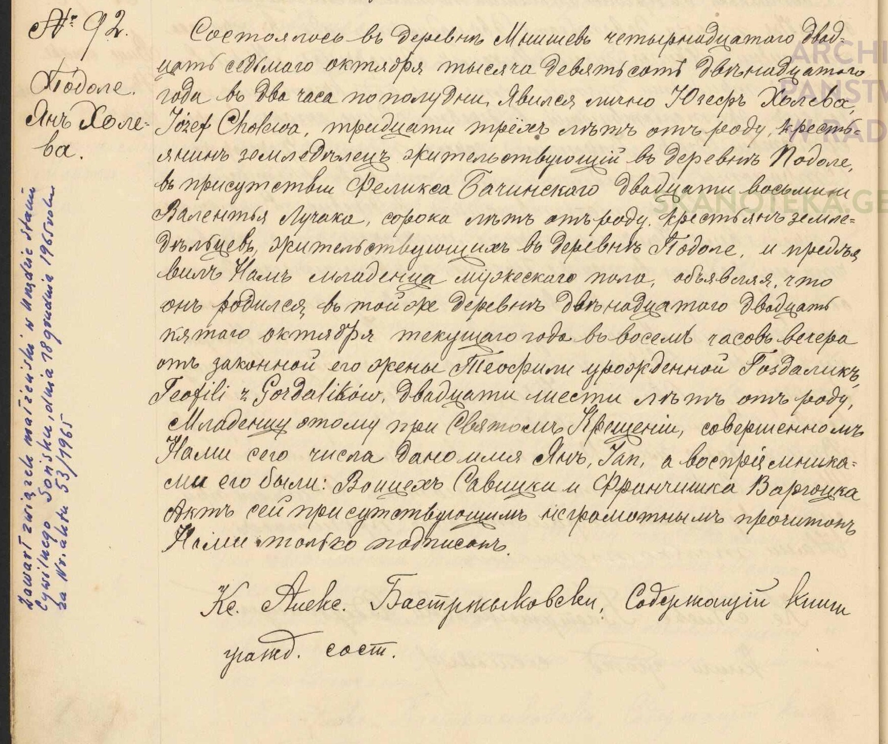 metryka urodzenia Jan Cholewa s. Józefa i Teofili Gozdalik 25.10.1912 Podole