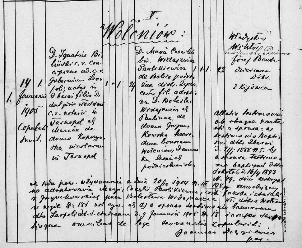 metryka ślubu Ignacy Biliński i Maria Cecylia Widajewicz Pawlikiewicz 14.01.1905 Wołcniów |