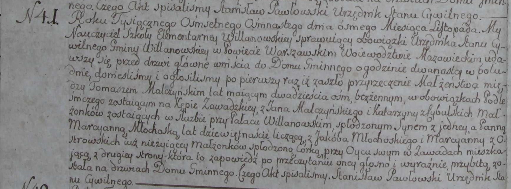 metryka ślubu Tomasz Malczyński i Marcjanna Młochowska c. Jakuba i Marianny zapowiedź 1 Warszawa Wilanów |